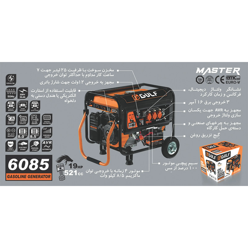 استارت الکتریکی , استارت دستی , تکفاز , دارای چرخ , سیستم خنککنندگی از راه روغن , ولتاژ خروجی 12 ولت DC